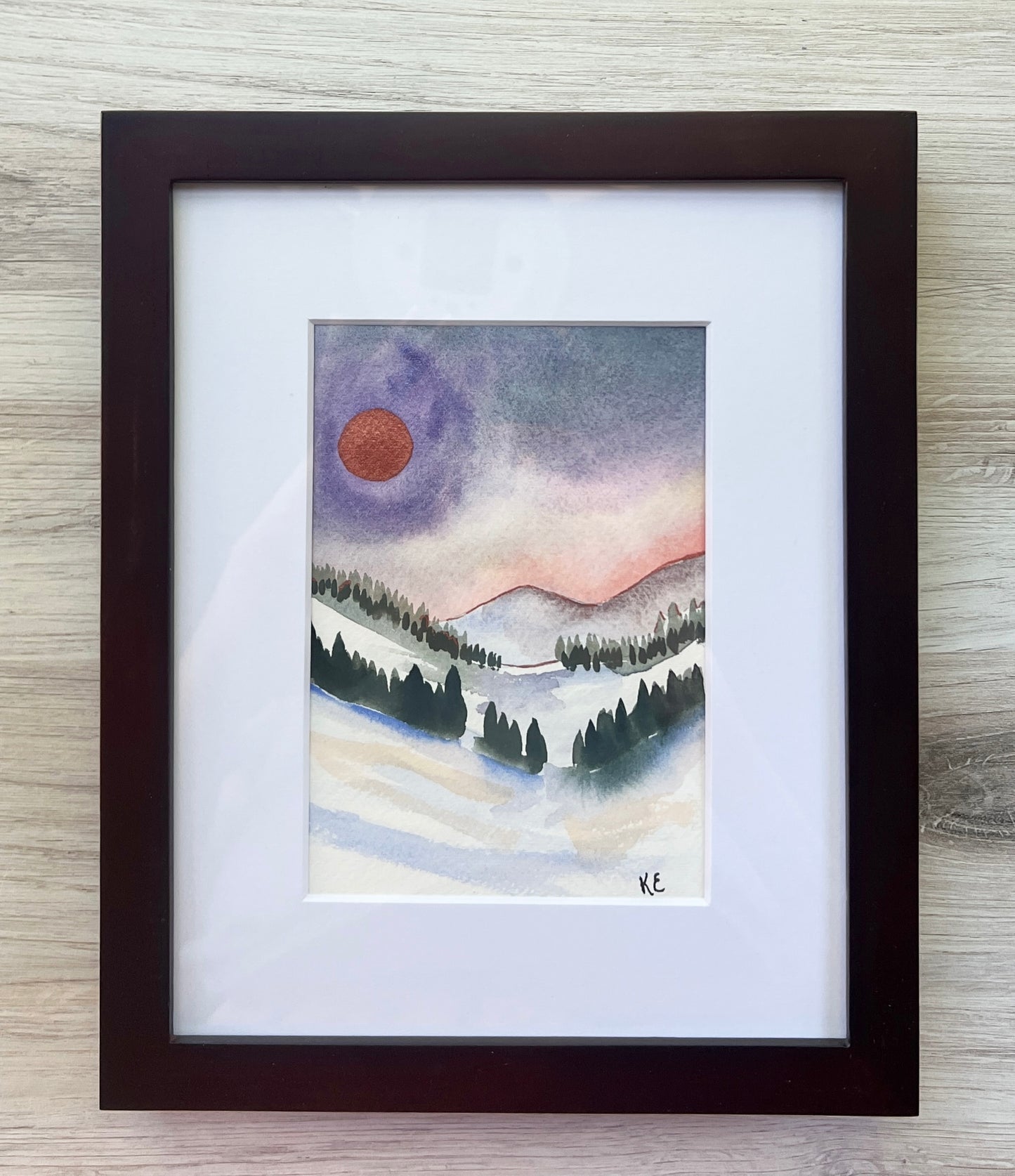 Winter Moon Glow, framed original watercolor on paper featuring metallic, light catching details.
